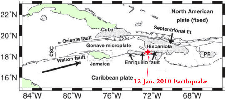 Frequent earthquakes in the Caribbean region have been responsible for great damage and loss of lives in the past. Major earthquake disasters occurred in Jamaica in 1692 and 1907, in Cape Haitien in 1842 and at Pointe-a-Pitre in 1843 (Tomblin 1991). Haiti is particularly vulnerable to earthquake destruction because of high population density and poor housing construction on steep slopes. There is a long record of past destructive earthquakes. The historic records indicates that most of the large destructive earthquakes in Haiti were related to the the E-W trending Enriquillo-Plaintain Garden fault system (EPGFZ), although destructive earthquakes have also occurred on the Septentrional Fault Zone (SFZ). Large, destructive earthquakes occurred in Haiti in 1701, 1751, 1770, 1842, 1860 and 1887 (Dixon et al., 1998; Scherer, 1912; Mann, 2005).