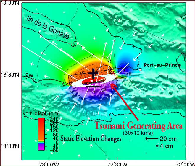 Tsunami Generating Area as inferred from Distribution of Static Elevation Changes and visual field observations (Modiified web map of reported static elevation changes with superimposed tsunami generation area estimated at 300sq. Kms.)