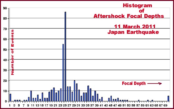 Plotting the aftershock focal depths along eastern Honshu (Peter Zhol - personal communication), indicates that there was a spectacular peak at a focal depth of about 24-25 km. The significance of this to tsunami generation is being evaluated in terms of regional, spatial subduction geometry, slip, crustal movements and sediment displacements.