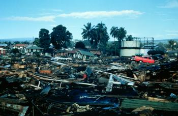 Tsunami del de mayo 24 de 1960, causada daño enorme en Hilo, Hawaii. (fotografía del Advertiser de Honolulu).